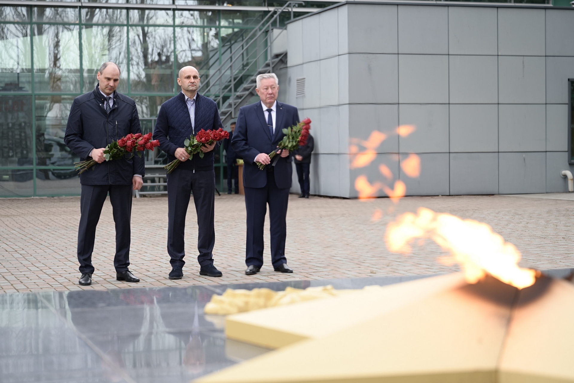 В завершение рабочей поездки на завод Денис Паслер, Артём Жога и гендиректор предприятия Николай Клейн возложили цветы к мемориалу памяти сотрудников завода имени М.И. Калинина, павших во время Великой Отечественной войны.