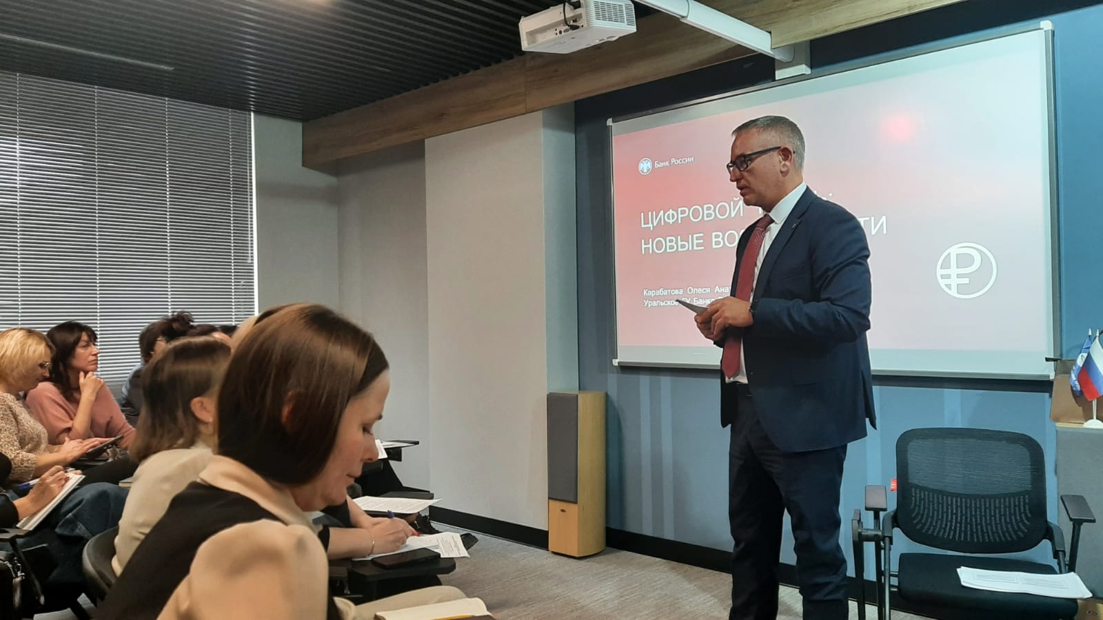 С большим интересом участники заседания выслушали выступление начальника отдела Управления платёжных систем и расчётов Уральского главного управления Банка России Карабатовой Олеси Анатольевны. Тема ее выступления была посвящена цифровому рублю – цифровой форме национальной валюты.