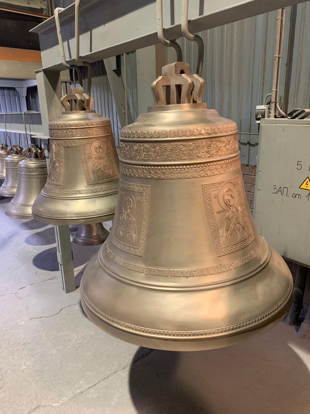 Колокола отлили специалисты колокольного завода «Пятков и К» в Каменске-Уральском. Они изготовили 8 изделий весом 6, 9, 15, 40, 86, 156, 326, 660 кг из сплава олова, бронзы и меди. Этот традиционный состав металлов определяет красоту, мощь, чистоту и яркость звучания, а нанесенные на корпус узоры, орнамент и иконы подчеркивают исконно русский стиль оформления.