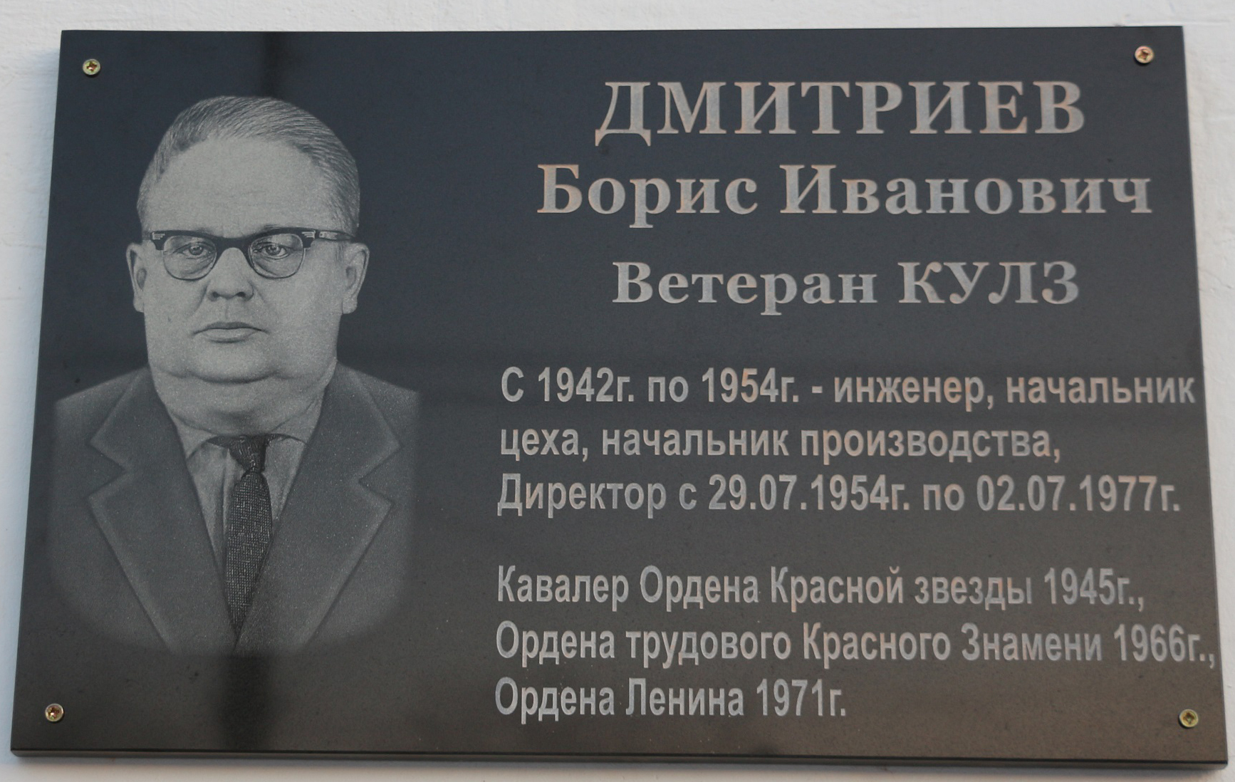 К 105-летию со дня рождения популярного руководителя завода Бориса Дмитриева (1954-1977 гг.) кулзовцы установили мемориальную доску. Памятный знак прикрепили на центральном заводском корпусе