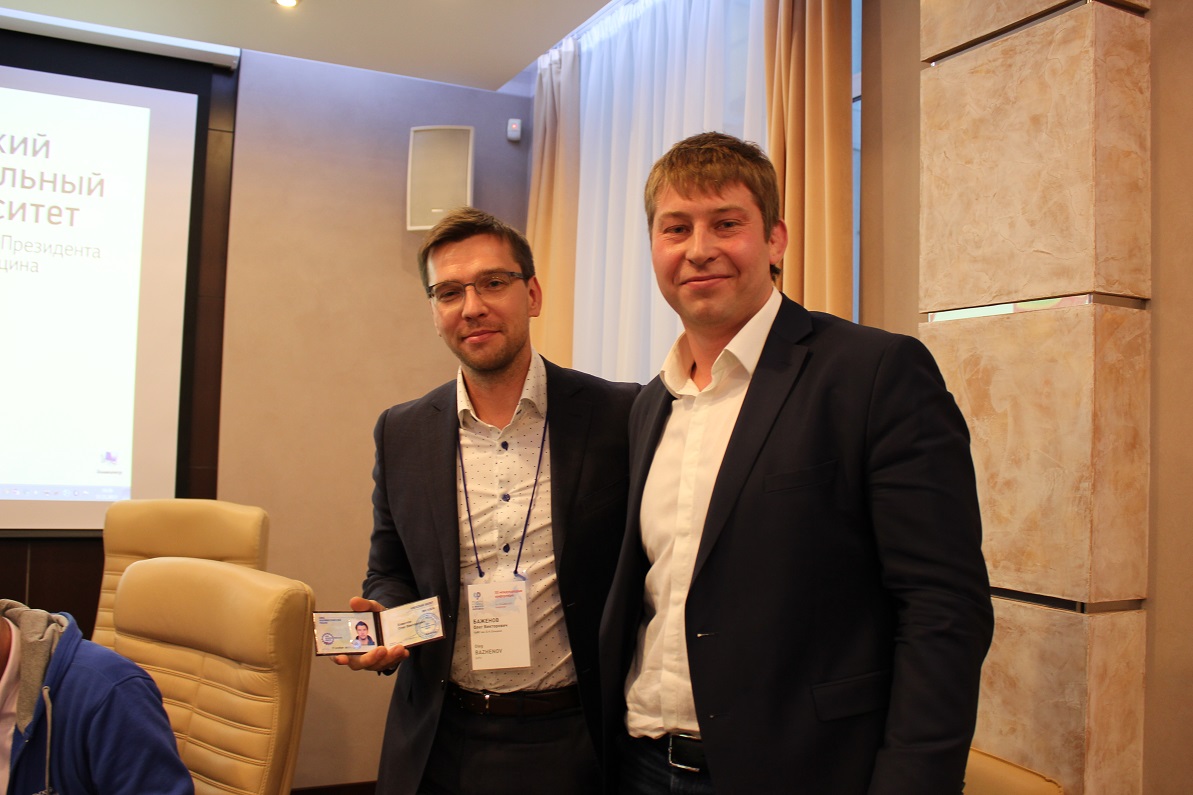 В заключении мероприятия Михаил Дегтярев торжественно вручил членский билет Свердловского регионального отделения Союза машиностроителей России руководителю тематической секции «Профессионал будущего. Кадровое обеспечение глобальной конкурентоспособности территории» кандидату экономических наук, доценту УрФУ Олегу Баженову.